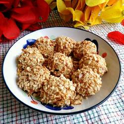 2.Take out the glutinous rice balls one by one and wrap them in crushed peanuts.Too many glutinous rice balls will easily stick together.