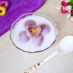12. Put the glutinous rice balls into a bowl, pour in warm pure milk, orange and purple The potato dumplings are ready.