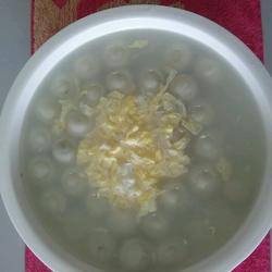 3.Add glutinous rice balls and cook until the glutinous rice balls float.Add beaten egg mixture.Add sugar and remove from pan.