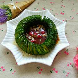 6.Put minced garlic, vinegar, sugar and diced dried chili peppers in the middle of the cucumber