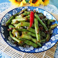 4.Then Add chopped green onion, minced ginger and shredded beef and stir-fry the diced beans