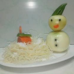 10. Insert the other end of the toothpick into the small onion, where the snowman's mouth is.
