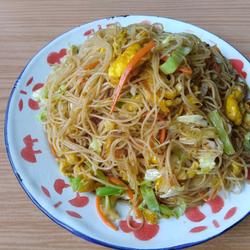 4. Heat the pan with cold oil and fry the pork belly to remove the oil and residue.Take it out, fry the eggs into egg droplets, cut the side dishes, stir-fry for one minute, add the rice noodles, add the seasoning prepared before, stir-fry for 5 minutes.
