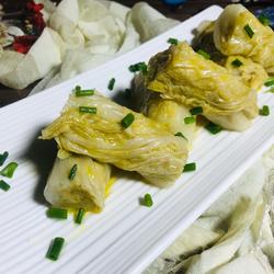 8. Cut the rolled cabbage into small sections, place it on a plate, and sprinkle with Chopped green onion, drizzle with sesame oil and serve