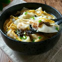 15.Pour in the cooked wontons, top with shredded egg skin and seaweed.