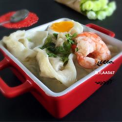 15. Cook the wontons and shrimps, season with salt, and sprinkle with minced coriander when putting them into a bowl., served with eggs.