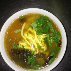 4. Add water to the pot and bring to a boil.Add wontons and cook.Take a bowl and add a little salt and MSG., chicken powder, pepper, sesame oil, Donggu soy sauce, seaweed, shrimp skin, coriander powder, add 6 minutes of wonton soup and mix well, add cooked wontons, top with some shredded egg skin and serve.