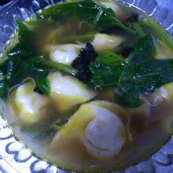 5.Put oil in the pot, add onion and ginger and sauté until fragrant, add soy sauce, salt, chicken essence, thirteen spices, add water, when the water boils, add the wrapped wontons, when When the wontons are almost cooked, add spinach and seaweed, and take them out of the pan