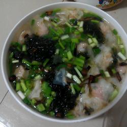 5.Put the seaweed and shrimp into pieces Put the ginger oil and chives into the soup bowl, pour the cooked wontons directly into the bowl, and you will have delicious wontons