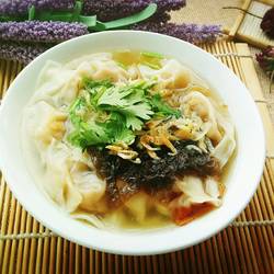 12. Boil the wontons and add shrimp skin, coriander, and seaweed.Add a few drops of sesame oil and flavor.A bowl of delicious Chaos is ready.