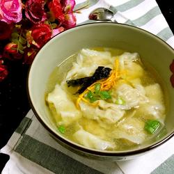 12. Take out the wontons and put them into a deep bowl, pour an appropriate amount of wonton soup, and finally Put appropriate amount of chopped green onion, seaweed, dried shrimps and sesame oil in the bowl.