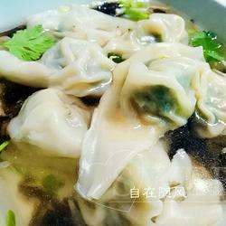 5.Put chopped green onion into the bowl Shrimp skin, seaweed, salt, chicken essence, some sesame oil, set aside.Boil water in a pot.Pour the boiling water into the bowl of prepared soup.Cook the wontons in the pot until cooked