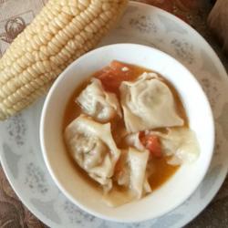 7.Put oil in the pan, stir-fry chopped green onion and tomatoes twice Add appropriate amount of water to boil, then add wontons and cook