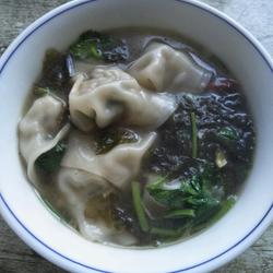 11.Put oil in a pot, heat water, a little salt, chicken essence, chicken essence water, boil the wontons, add seaweed, coriander and wait until the wontons are ready