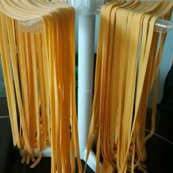 4.Then apply on the dough Dot some dry flour and cut into wide noodles with the wide noodle knife of the dough press.Cut and place on the noodle drying rack to wake up