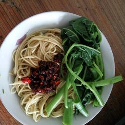 5.Put the cooked noodles into a bowl, add water spinach into the pot, scoop it up and put it aside when it is cooked In the bowl, put a spoonful of Laoganma oil chili.