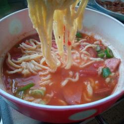 4. Cut a small opening in the plastic bag, squeeze out the noodles (be sure to use medium heat when squeezing the noodles into the pot, otherwise the noodles will be broken as soon as they are put into the pot), add salt, cook and remove from the pot, sprinkle with chopped green onion, ham sausage or yourself Favorite vegetables