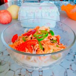6.Put a little less oil in the pot, add onions, tomatoes and peppers, and stir-fry the soup.