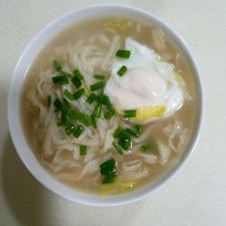 5.After the water boils, put the noodles in the pot (heat the pot and cool the oil, heat the oil and fry the chopped green onions until fragrant, add the cabbage, stir-fry a few times, pour the water and bring to a boil)