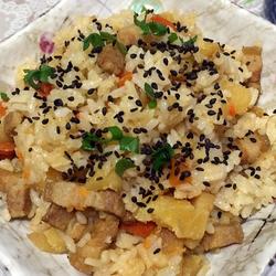 9.Pour the fried potatoes, pork belly, etc.on the rice;