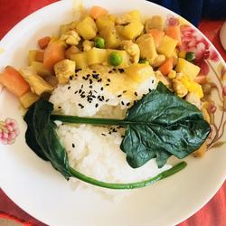 6.After the rice is steamed, put it into a small bowl and place it on a plate, top it with the prepared curry chicken, and sprinkle a little black sesame seeds on the rice as a garnish~