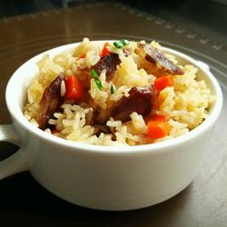 10.Pour all the fried sausage, diced carrots and other ingredients plus the soup into the rice pot , covering the rice evenly.Then start cooking rice as you normally would.