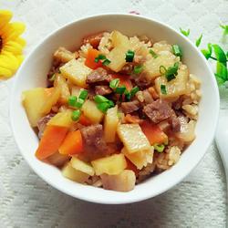 12.After cooking, simmer for two minutes, and the fragrant bacon and potato braised rice will be ready