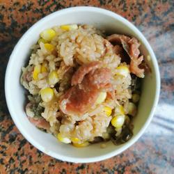 5.Put eggplant, sausage, and corn kernels on top of the rice.