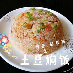 11. Pour the fried potatoes and ham into the rice cooker and spread it on top of the rice.Close the lid and press the cooking button.