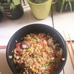 3.Saute spareribs and side dishes until fragrant, add rice and drain them