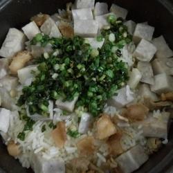 4.I cut some fat pork, first When it is almost slightly brown, add the taro and stir-fry for a while, then add the lean meat and stir-fry, then add the rice and stir-fry for a while, turn off the heat, put it into the rice cooker and add an appropriate amount.of water, you can cook