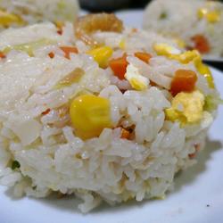 1.Soak shrimp until soft, wash and dice fresh squid, mix well with a small amount of salt and cooking wine, dice cabbage, chicken breast sausage, carrots, corn kernels, and green beans and boil them in water Remove and drain for 1 minute.