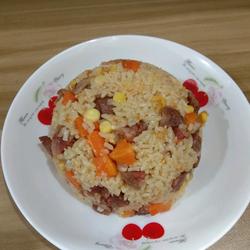 4.Pour in sausage, carrots, corn, a little salt and light soy sauce and stir-fry.