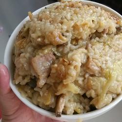 5. After the pork belly oil is stir-fried, add onions and ginger and saute until fragrant.Then add shiitake mushrooms, day lily, cabbage, and rice in turn and stir-fry for a while,