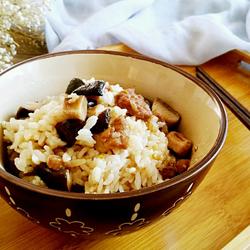 8.Pour the fried diced mushrooms and pork into the rice cooker and turn on the rice button