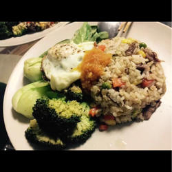 4.Wait another ten minutes and you can start eating.Put the vegetables on the plate first, then mix the meat and rice in the rice cooker, take it out and put it on the plate.In addition, I fried an egg.According to your own habits, you can mix it with sugar hearts and eat it,