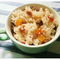 4.Put tomatoes in the middle of the rice, add potatoes, carrots, and mushrooms.Add appropriate amount of oil, white pepper, and a little salt if it's heavy.Wait until you jump to the keep warm button before adding dried tofu and ham.