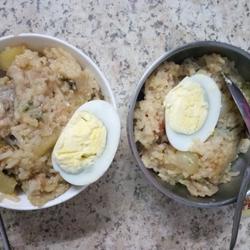 2.Wash the rice and put it into the rice cooker to cook until the water is almost dry.Spread all the marinated ingredients evenly on top