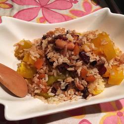 14. Put the stewed pumpkin rice into a bowl and add some vegetables to make it look better