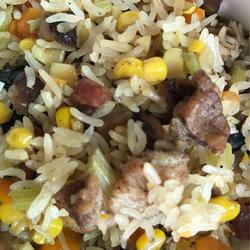 3. Fry the soaked dried mushrooms and set aside.Stir-fry the pork (if you are worried about it being too oily, you can remove the large pieces) Trim off the fat or force out the oil during frying) then add sausage, diced carrots, corn kernels, dried radish, fungus, then add oyster sauce, soy sauce and other seasonings, stir-fry until half cooked