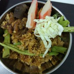 6. When the rice is cooked until the water is almost dry, add the green beans, crab sticks, crispy meat and fungus