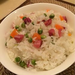 4. Wash the peas, cut the carrots into pea-sized dices, and cut the sausage into pea-sized dices and set aside