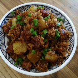 1. Sausage, potatoes, rock sugar and dark soy sauce.Cut potatoes into cubes