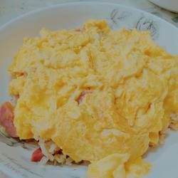 1. Prepare eggs, rice and ham.(My pot is bigger, put more eggs.) (Cut ham into cubes)