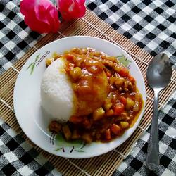 7.Finally, take a bowl, fill the rice with the rice and pour it into the plate.Top with the cooked curry chicken and you are ready to eat
