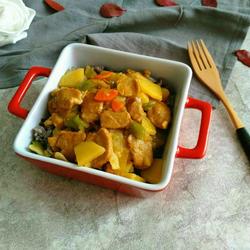 2. Wash and slice potatoes and carrots, cut bell pepper into small pieces, onion, ginger and garlic Cut and set aside.