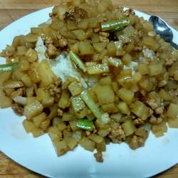 12.Pour the diced potatoes on the rice.Just cover the rice with the diced potatoes.have eaten.