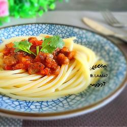 Pasta resists cooking, so it doesn’t matter if it takes a few minutes longer to cook; the pasta sauce I use is the pizza sauce I’ve made before, and I think it can be used universally; the salt in the sauce is enough, so there’s no need to add any more salt; The diced meat is very small and will be cooked when it changes color.Add the rest of the ingredients and stir-fry for a few times before turning off the heat.
