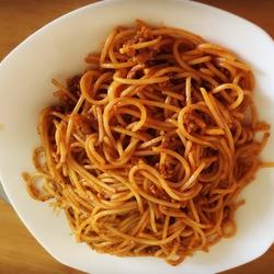 After the pasta meat sauce is cooked, reduce the heat to low until the noodles are well stir-fried and then turn off the heat