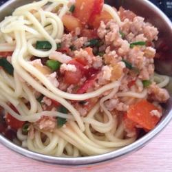 1. Dice the tomatoes and stir-fry the minced meat together , add salt and soy sauce